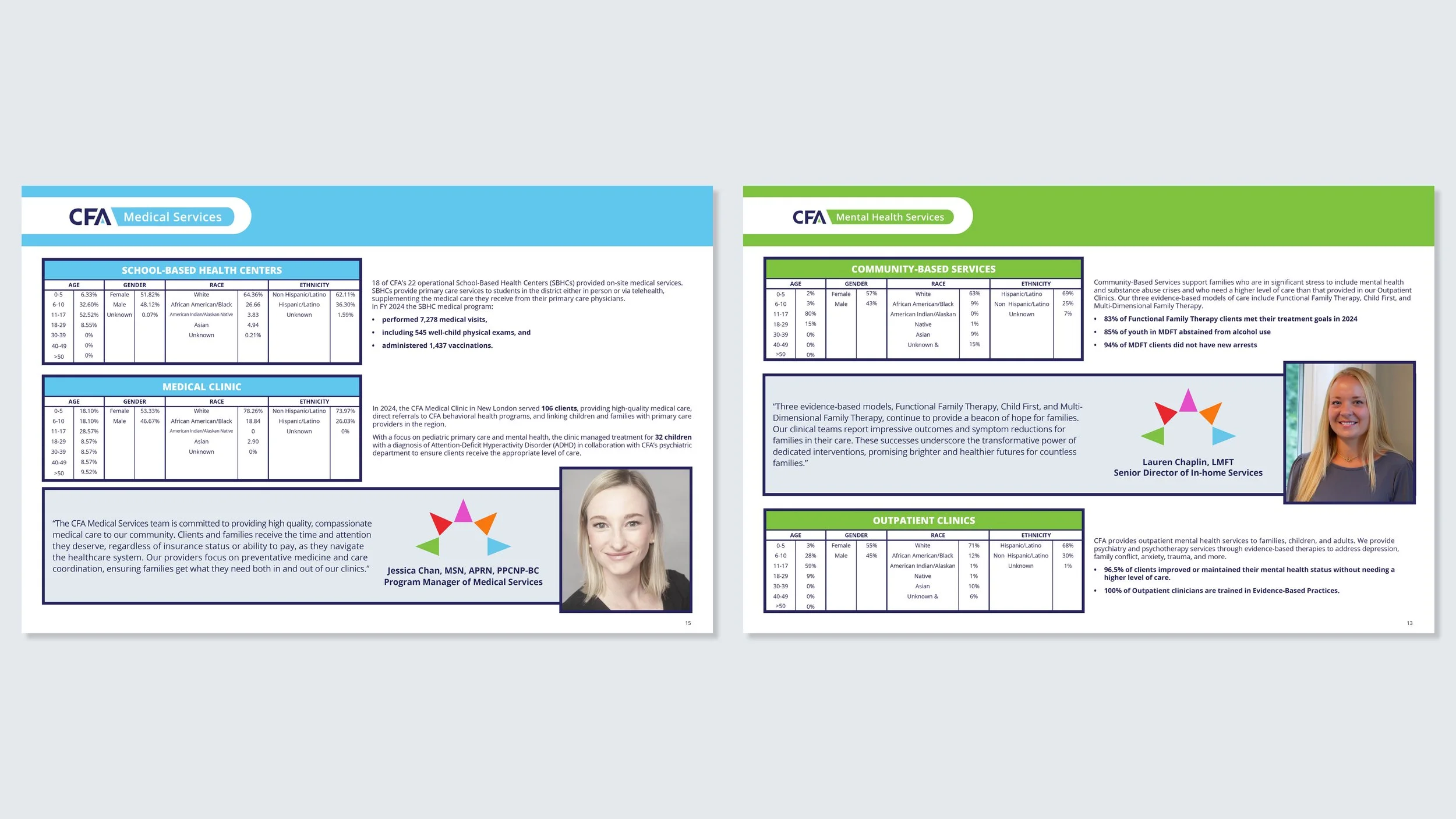 Problem & Solution: Working with partially pre-established document, I redesigned it from a double-page document to a single page document to fit better with the digital versus print look. I have also helped to update the document with new materials such as tables and quotes in a consistent way through the document, and updated the overall branding to better reflect the current rebrand. This meant using mostly navy and gray-blue, and adding color only to some of the element for the program specific pages, making it consistent with brand template that I have already created (see brand roll-out page).